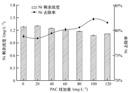 調(diào)節(jié)水樣pH為7.0,EDTC投加量為nEDTC/nNi=4,反應(yīng)時(shí)間為15 min,考察PAC投加量對(duì)Ni去除效果的影響,結(jié)果如圖 5所示.Ni剩余濃度隨著PAC投加量的增加而減小,Ni去除率隨著PAC投加量的增加而增大,PAC投加量為100 mg·L-1時(shí),去除率較高,達(dá)83.15%,Ni剩余濃度為1.08 mg·L-1.