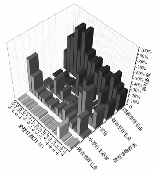 不同類群微型動物的變化規律不同,主要類群相對多度隨時間的變化如圖 3所示.其變化主要有以下幾種類型:①“前低后高”型,主要為固著型纖毛蟲,4月份固著型纖毛蟲所占比重相比較小,隨后逐漸增大,到6月上中旬呈現兩個高峰分別達到87.1%、85.0%,之后呈下降趨勢;微型后生動物4月份平均相對多度波動較大,5月初直到6月中下旬波動不大,6月下旬呈明顯上升趨勢;②“前高后低”型,匍匐型纖毛蟲4月份和5月份所占比例大體相近,到6月份匍匐型纖毛蟲明顯減小,以致后期幾乎消失;其他類型的微型動物(包括鞭毛蟲、有殼變形蟲等)也有類似的規律;③“平穩型”,肉食型纖毛蟲在整個研究期間內平均相對多度變化不大,且處于較低水平,平均相對多度為4.41%.