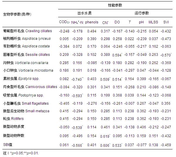 從表 2可見,有6個生物學參數與出水水質或運行參數存在著顯著的相關性(p<0.05).其中,生物學參數與出水水質之間,累枝蟲屬(Epistylis spp.)與出水氨氮(r=-0.740,p<0.01)、氰化物(r=0.509,p<0.05),吸管蟲屬(Podophrya spp.)與出水氨氮(r=-0.593,p<0.05),微型動物多度與出水氨氮(r=-0.539,p<0.05),微型動物種數與出水氰化物(r=0.619,p<0.05),以及SBI值與出水氨氮(r=-0.566,p<0.05)、氰化物(r=0.606,p<0.05)相關性顯著,可見累枝蟲屬(Epistylis spp.)的大量出現預示著較低的出水氨氮濃度和較高的出水酚、氰濃度;吸管蟲屬(Podophrya spp.)的大量出現預示著較好的硝化效果,而其他生物學參數與出水水質的相關性不顯著(p>0.05).
