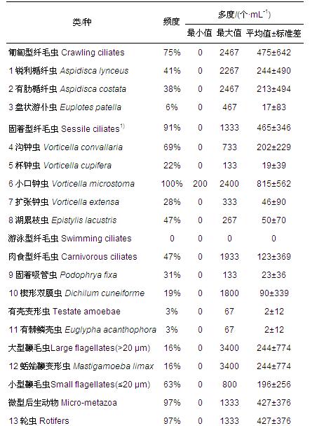 整體上看,頻度越大對應微型動物種或類群的多度也越大,但也有例外,如溝鐘蟲(V. convallaria)的頻度(69%)大于銳利楯纖蟲(A. lynceus)(41%)和有肋楯纖蟲(A. costata)(38%),而后兩者的平均多度卻均大于溝鐘蟲(V. convallaria),這說明某些種屬在系統中盡管數量較少,但可頻繁出現.