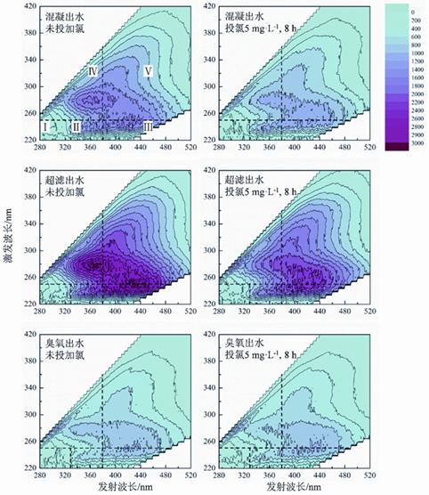 加氯前后再生水水樣的三維熒光光譜如圖 4所示.根據(jù)Chen等(2003)的區(qū)域熒光強(qiáng)度積分理論,三維熒光光譜可分為5個(gè)區(qū)(Ⅰ~Ⅴ),分別代表酪氨酸類蛋白質(zhì)、色氨酸類蛋白質(zhì)、富里酸類腐殖質(zhì)、芳香族蛋白質(zhì)和腐殖酸類腐殖質(zhì).從圖 4可以看出,不同再生水水樣加氯后的熒光強(qiáng)度積分均有所降低.加氯8 h后,混凝出水、超濾出水、臭氧出水的全區(qū)域熒光強(qiáng)度積分分別降低29%、20%和23%.
