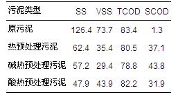 由表 1可知,經過熱預處理、堿熱預處理、酸熱預處理,污泥的SCOD/TCOD值都有所提高.這是由于污泥細胞中的糖和蛋白質釋放到可溶解相中的緣故,經過堿熱處理后,SCOD/TCOD值最大(0.56),這說明堿熱預處理對污泥細胞破碎的效果最好.SCOD/TCOD值的提高表明3種預處理方法均有效地破壞了污泥細胞,從而釋放出其中的生物高聚體.