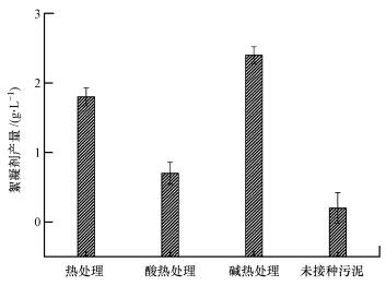 如圖 1所示,實驗過程中,發酵60 h后,菌株利用經直接滅菌處理(即熱預處理)污泥制備微生物絮凝劑的產量為1.6 g · L-1;同樣條件下,利用經酸熱預處理污泥誓由制備微生物絮凝劑產量0.6 g · L-1,利用經堿熱預處理污泥制備微生物絮凝劑產量為2.3 g · L-1.而污泥于35 ℃、150 r · min-1的條件下直接發酵60 h(未接種菌株)后,微生物絮凝劑的產量低于18 mg · L-1.由此可見,微生物絮凝劑產量的多少歸因于污泥的不同預處理方法,堿熱預處理的污泥更有利于菌株生產微生物絮凝劑.對污泥進行預處理可使污泥細胞破碎,釋放出污泥中的可溶性有機物和氮化合物,從而有助于微生物菌株的生長和繁殖(Sun et al., 2012).有研究表明,在堿性條件下,污泥細胞破碎所釋放的可溶性化學需氧量和其它低分子量的水溶性碳化合物要比酸性條件下更多,酸誘導污泥細胞破碎增容的能力劣于堿(Aravinthan et al., 2001),這驗證了本實驗中堿熱預處理的污泥更有利于菌株生產微生物絮凝劑的結論.