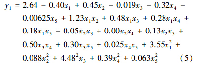 以SRF為響應值建立的二次回歸模型如式(5)所示,方差分析結果顯示,p<0.0001<0.05,決定系數R2為0.9057,表明模型顯著;相關系數r為0.9517,表明獨立變量之間的相關性較好,響應值y1(SRF)的二次回歸模型擬合較好.