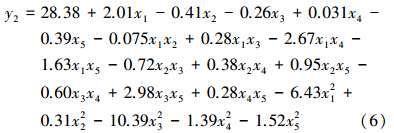 以DS為響應值建立的二次回歸模型如式(6)所示,方差分析結果顯示,p<0.0001<0.05,決定系數R2為0.9171,表明模型顯著;相關系數r為0.9577,表明獨立變量之間的相關性較好,響應值y2(DS)的二次回歸模型擬合較好.