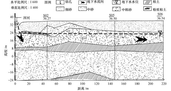 研究區(qū)位于渾河中下游高漫灘及一級階地,地層巖性結(jié)構(gòu)特征相對比較簡單,除表層分布有4 m左右的亞砂土和壤土外,巖層巖性為中粗砂及粗砂夾卵礫石,卵礫石含量及粒徑隨著距河流距離的增加而減少.在粗砂夾卵礫石的巖層中有不連續(xù)的粘土層分布,靠近渾河處厚度1~2 m,隨著距渾河距離的增加,厚度可增加至5 m.