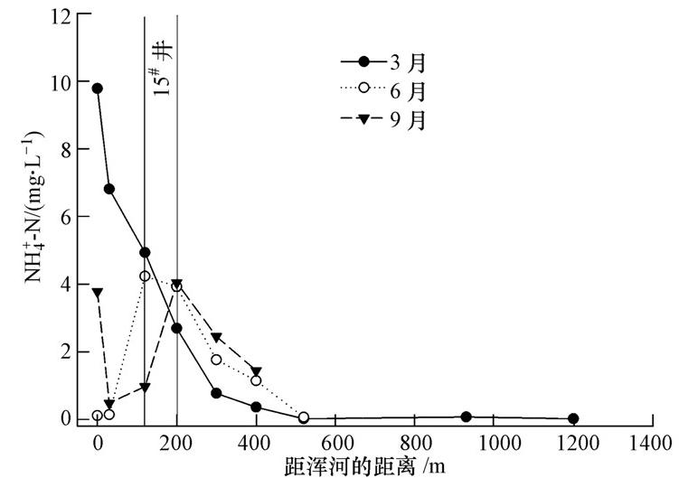 河水和地下水樣品檢測結(jié)果表明,受季節(jié)因素和上游污染物濃度變化的影響,渾河中NH4+-N濃度變化較為明顯,枯水期(3月),河水中的NH4+-N濃度較高(7~10 mg · L-1),導(dǎo)致研究區(qū)15#水源井地區(qū)NH4+-N濃度較高(>2 mg · L-1);豐水期(6月)和平水期(9月),河水中NH4+-N濃度均較低(<4 mg · L-1),但研究區(qū)15#水源井(150~200 m)NH4+-N濃度依然在2 mg · L-1以上(圖 2).產(chǎn)生這種現(xiàn)象的原因可能是枯水期殘存在含水層中的NH4+-N解吸所致.可見,渾河是研究區(qū)NH4+-N污染的主要來源,其污染分布特征是由渾河始,沿渾河逐步向外部地下含水層擴散.
