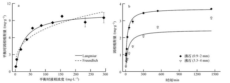 圖 3 法庫天然沸石對NH4+-N的等溫吸附線(a,25℃)和吸附動力學(xué)(b,準二級模型)