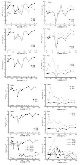 綜上所述,PRB1、PRB6不能實現(xiàn)NH4+-N的有效去除,PRB2、PRB3、PRB4及PRB5對NH4+-N去除效果明顯(去除率>99%).但PRB 2存在沸石吸附飽和問題,PRB 3 能解決沸石吸附飽和的問題且造價低廉,PRB 4及PRB 5使用的陶粒價格昂貴,但對生物硝化的增強作用并不特別明顯.沸石的購買價格為120元 · t-1,陶粒為1000元 · t-1,綜合考慮成本、運行效果及壽命等各方面因素影響,PRB3的工程應(yīng)用價值最高,因此,建議工程示范中采用ORC+沸石分層填充的復(fù)配方式.