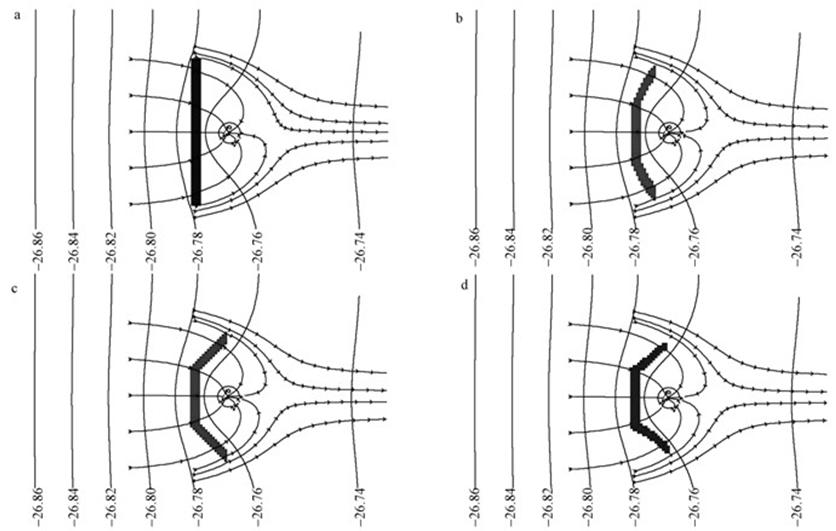 圖 5 直線型PRB截獲區(qū)(a,直線部分15 m)、30°連續(xù)PRB截獲區(qū)(b,PRB直線部分6.25 m,弧部分2×4.5 m)、 45°連續(xù)PRB截獲區(qū)(c,PRB直線部分6.25 m,弧部分2×4.5 m)、 60°連續(xù)PRB截獲區(qū)(d,直線部分6.25 m,弧部分2×4.5 m)效果模擬(圖中垂直方向的線表示地下水等水位線(單位:m),水平箭頭方向表示地下水流向)