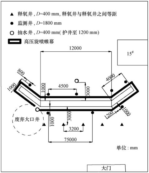 為了便于添加ORC,通過ORC與地下水接觸釋放氧氣增加反應(yīng)系統(tǒng)中的溶解氧,增強生物硝化反應(yīng),進而達到生物氧化NH4+-N的目的,在PRB系統(tǒng)上游3 m處設(shè)置了5口釋氧井,平行于PRB 1行5列布置,井徑400 mm,在埋深14~35 m處為氧氣釋放部位.當?shù)叵滤蠳H4+-N含量較低時,ORC可以暫不放入.