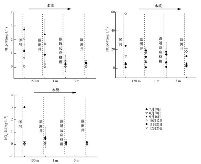 在保證被反應(yīng)介質(zhì)吸附的NH4+-N能夠完全被生物去除所需的時間條件下,可得PRB的厚度B=0.0022 m · d-1×5 d≈0.011 m.考慮到實際運行過程中的水質(zhì)波動及其他環(huán)境條件變化對微生物的影響,選取安全因子為3.0,因此,示范工程應(yīng)保證PRB厚度不小于0.033 m.