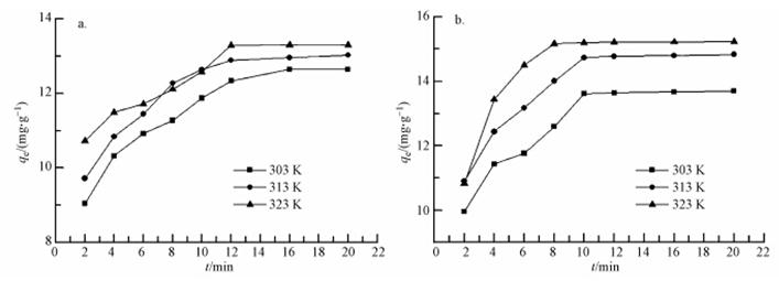 圖 1 不同溫度下殼聚糖改性膨潤土(a)和DMDAAC改性膨潤土(b)吸附石油類污染物的動力學曲線