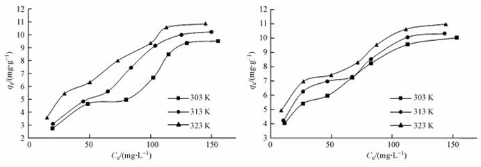 觀察圖 2可以發(fā)現(xiàn),當平衡吸附質(zhì)濃度(Ce)在50 mg · L-1的時候,吸附等溫線上升緩慢.在30~50 ℃之間,石油類污染物微粒的平均動能足以滿足發(fā)生化學吸附所需的條件,因此,吸附過程同時存在物理吸附和化學吸附.根據(jù)有效碰撞理論,活化分子越少,有效碰撞的概率就越低,因此,化學吸附速率是和石油類污染濃度成正比的,而物理吸附在低濃度時速率基本不變.當濃度上升到一定程度時,物理吸附到達了單層吸附極限,隨著濃度繼續(xù)增加,石油類污染物排列更加緊密(趙振國,2005),并且由于平均動能過大,無法形成多層吸附,所以在50 mg · L-1左右時,吸附等溫線上升緩慢.當濃度繼續(xù)增加,石油類污染物和化學吸附位點有效碰撞的概率增加,化學吸附作用逐漸增大,直到吸附平衡.