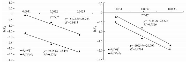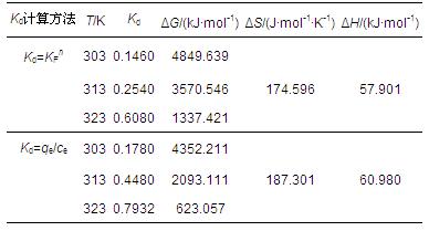 吸附熱力學平衡常數(shù)Kd與表征吸附過程熱力學特性的標準吉布斯自由能變(ΔG)、標準反應(yīng)焓變(ΔH)和標準反應(yīng)熵變(ΔS)的關(guān)系如下: