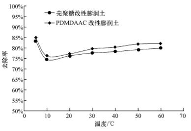 取100 mL 50mg · L-1的含油廢水于250 mL燒杯中,加入4 g改性膨潤土,調(diào)節(jié)pH為7,分別在5、10、20、30、40、50、60 ℃下,攪拌10 min,攪拌速度為450 r · min-1.靜置,之后測量上清液含油量,用2.5節(jié)中的方法計算去除率,結(jié)果見圖 4.