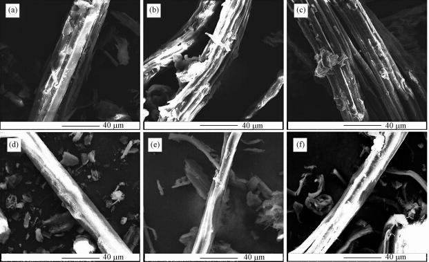 圖 2 掃描電鏡圖(a. 原玉米秸稈;b. 堿化玉米秸稈;c. NTAA-CS;d. 原苧麻稈;e. 堿化苧麻纖維;f. NTAA-RF)