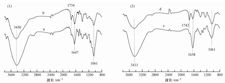 圖 3 紅外光譜分析(a. 堿化玉米秸稈;b. NTAA-CS;c. 堿化苧麻纖維;d. NTAA-RF)