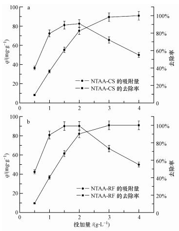 圖 4 吸附劑投加量對Cd2+去除的影響(a. NTAA-CS;b. NTAA-RF)