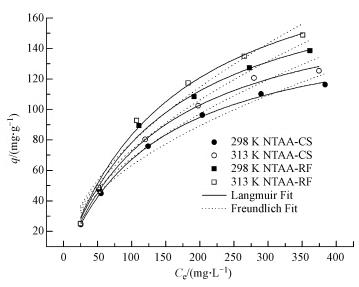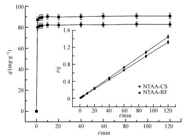 圖 5所示為NTAA-CS和NTAA-RF對Cd2+的吸附隨時間的變化情況和偽二級動力學方程對試驗數據的線性擬合結果.可以看出,NTAA-CS和NTAA-RF對Cd2+的吸附是一個快速吸附過程,在5 min內即達到吸附平衡.NTAA-CS和NTAA-RF對Cd2+的最大吸附量分別為82.06 mg · g-1和90.83 mg · g-1.偽二階動力學參數如表 1所示.由圖 5和表 1可以看出,偽二階動力學模型可以對實驗結果進行很好地擬合,可決系數R2接近1,且擬合得出的平衡吸附量和實際吸附量很接近.因此,NTAA-CS和NTAA-RF對Cd2+的吸附是化學吸附.