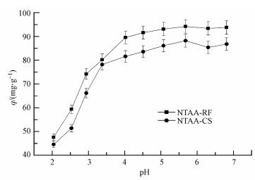 NTAA-CS和NTAA-RF的投加量對Cd2+的去除效果如圖 4a和b所示.當NTAA-CS和NTAA-RF的投加量為0~2 g · L-1時,Cd2+的去除率均急劇增加,從10%增加至80%左右.當NTAA-CS和NTAA-RF的投加量大于2 g · L-1后,Cd2+的去除率隨吸附劑投加量的增大而緩慢增加,但吸附量卻呈現出漸減的趨勢.當吸附劑的投加量達到3 g · L-1時,Cd2+的去除率接近100%.為達到較好的去除效果和較高的吸附劑利用率,NTAA-CS和NTAA-RF的最佳投加量都為2 g · L-1,且NTAA-RF對Cd2+的去除效果優于NTAA-CS.這可能是因為NTAA-RF所引入的氨三乙酸分子更多,吸附官能團如羧基也越多,吸附能力越強.