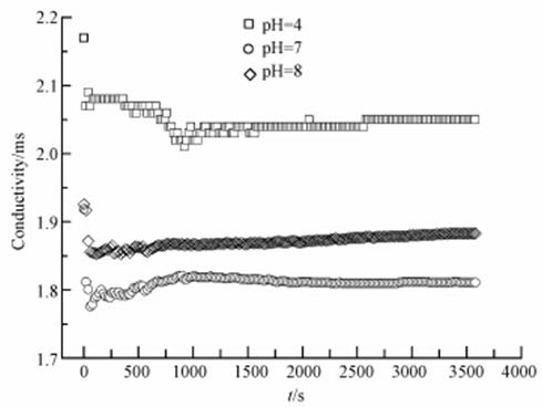圖 6 不同初始pH下PAC絮凝過(guò)程液相電導(dǎo)率變化趨勢(shì)