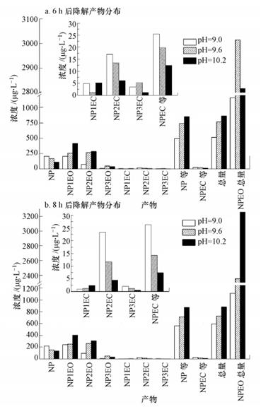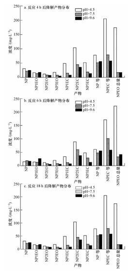 對比圖 7不同時間點上NPEO及NP(1~3)EC的濃度變化,可以看到,經過6 h反應,NP及NP(1~3)EO的含量逐漸減少,個別樣品(主要在酸性和中性條件下)的NP(1~3)EC濃度出現上升.該結果表明,好氧條件下NP(1~3)EO得到有效去除,而NP(1~3)EC則可能因為酸性氧化電位增高從而濃度增加.