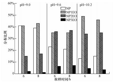 圖 4顯示了相同pH不同反應時間下,NP及各NP(1~3)EO占NP及NP(1~3)EO總量的比例.盡管COD隨反應時間改變發生了較大變化,但NP等4種產物各自所占的比例沒有發生明顯的變化,反應時間的延長沒有改變4種物質水相中的分布比例.