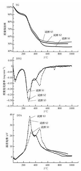 從工業分析結果來看(表 2),此污泥揮發分高,難燃燒的固定碳少,因此,污泥易于著火燃燒.3種試樣在升溫速率為10 ℃ · min-1時的勢量(TG)、微商勢量(DTG)和差熱分析(DTA)特性曲線如圖 1所示.由TG特性曲線可以發現,失重率為試樣S1最高,試樣S2次之,試樣S3失重率最低,這是由于隨著調理劑添加量的增大,試樣中的灰分增多,可燃質比重減小.
