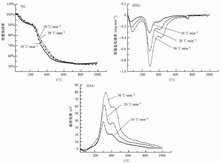 實驗采用北京恒久科學儀器廠生產的綜合熱分析儀HCT-3,從中可以獲得TG、DTA、DTG及溫度曲線. 其他主要技術參數如下:熱天平精度 0.1 mg;溫度范圍為室溫~1500 ℃;升溫速率范圍為0~30 ℃ · min-1;實驗氣氛為空氣.