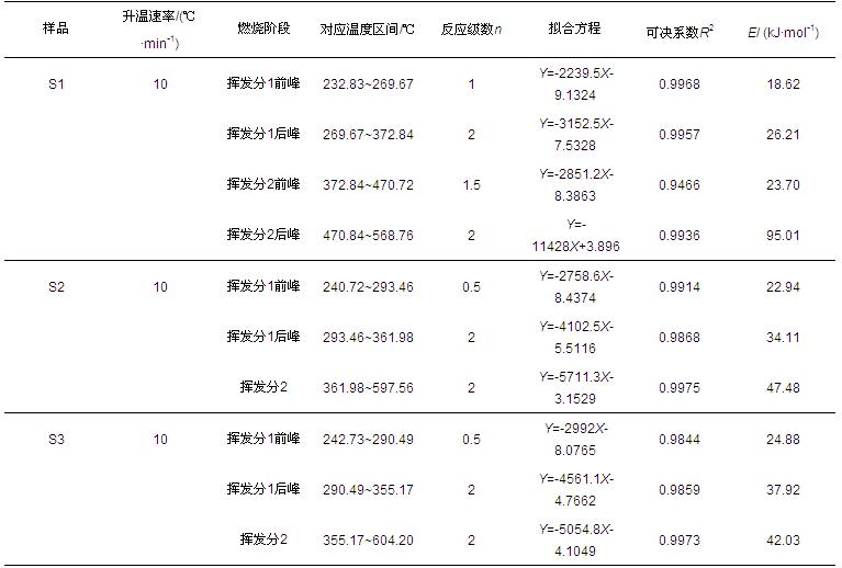 在燃燒動力學參數中,活化能代表反應物的分子由初始穩定狀態變為活化分子所需要吸收的能量,活化能比著火溫度更能從本質上表現試樣的著火性能.從表 5來看,揮發分1前峰的活化能隨升溫速率的增大而有略微的增大.這是由于升溫速率過快,導致試樣顆粒內外溫差大,顆粒外層熱解氣沒及時擴散,影響到內部熱解的進行.王輝等(2007)研究還指出,升溫速率過快會導致水分析出后無法迅速被吹走,而在樣品四周形成一種水蒸氣幕屏蔽的效果,阻礙揮發分析出和熱量的進入;同時,升溫速率大對樣品有熱沖擊,能使低升溫速率下難斷裂的側鏈和官能團開始斷裂,從而導致活化能增大.