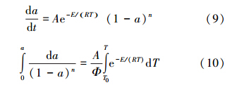 式中,τ為反應時間(min),k為速率常數(min-1),n為反應級數,a為轉化率,W0是試樣初始質量(mg),WT為試樣在溫度T時的質量(mg),W∞為實驗燃燒最終質量(mg).