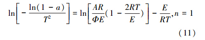 式中,R為氣體常數,取值為8.314 J · mol-1 · K-1;E為表觀活化能(J · mol-1);A為頻率因子(min-1或s-1). 定義升溫速率:φ= dT/dτ,聯合以上各式,根據熱重曲線,利用積分法(Coats-Redfern 方程)求解試樣的燃燒動力學參數(陳鏡泓等,1985):