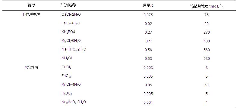 兩種不同來源的種泥在血清瓶中的污泥濃度分別為:①實際污泥:MLSS≈22.28 g · L-1,MLVSS≈14.56 g · L-1;②消化污泥:MLSS≈22.37 g · L-1,MLVSS≈17.69 g · L-1.兩種污泥分別設置3個平行樣(編號:1、2、3),并各設置1個不加基質的空白樣瓶.實驗中,以6 d作為1個周期進行底物置換,并進行相應指標檢測,具體實驗方案列于表 1.細菌培養(yǎng)所需微量元素通過向血清瓶分別添加DIN EN ISO 11734 L47(簡稱L47)和DIN EN ISO 11734(簡稱M)培養(yǎng)液來補充,其成分見表 2.