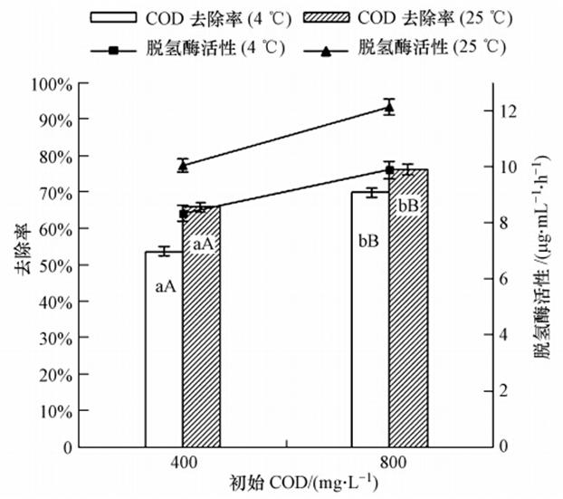 圖 4 初始COD對COD去除率及DHA活性的影響(注:不同小寫字母表示同一溫度下不同處理的COD去除率的差異顯著(p<0.05),不同大寫字母表示同一溫度下不同處理的COD去除率的差異極顯著(p<0.01),下同)