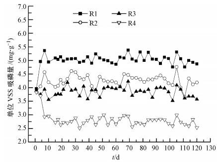為更準確的表達各反應器的除磷性能,圖 3給出了長期運行下單位VSS的除磷量的變化.由圖 3可見,不同DO濃度條件下各反應器單位VSS除磷量亦有較大差異.污泥馴化階段,R1、R2和R3中單位VSS磷的去除量逐漸增大,而R4中單位VSS磷的去除量逐漸減小.穩定運行后,隨著DO增大,各反應器中單位VSS除磷量依次減少.