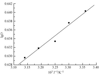 ,其中,R為通用氣體常數,其值為8.314 J · mol-1 · K-1; D為分配比;ΔH為反應的焓變(J · mol-1);T為溫度(K).作不同溫度下lgD與1/T關系圖(圖 2),該直線斜率-