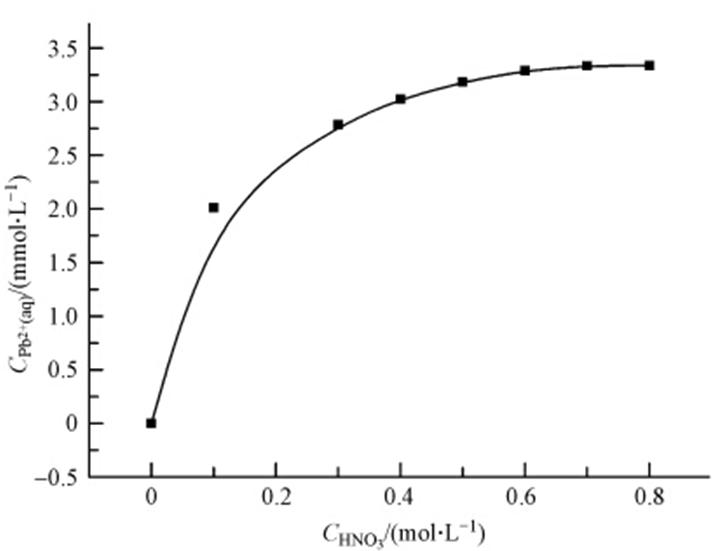 由上表可知,NaOH與鉛離子反應生成Pb(OH)2沉淀,但是在pH≥12時,Pb(OH)2溶于強堿時形成亞鉛酸鹽,所以NaOH溶液對DNNSA-P204負載鉛的煤油溶液有一定的反萃效果.加入硝酸和鹽酸時反萃取效果都比較好.由于硝酸鉛水溶性最好,其工業用途較廣,以下實驗均采用硝酸做反萃劑,以硝酸鉛的形式回收鉛.