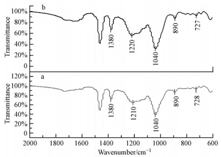 圖 4 負載鉛的DNNSA-P204煤油溶液萃取前后的紅外譜圖(a. DNNSA-P204煤油溶液萃取前;b. 負載鉛的DNNSA-P204煤油溶液)