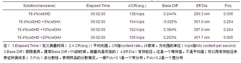 紅外光譜結果表明,在DNNSA中添加P204確實能夠形成混合反膠團,那么該混合反膠團空腔是否會由于P204的加入而發生改變?而這也是能夠產生正協同萃取的關鍵所在.實驗采用BI-200SM廣角激光光散射儀對萃取劑19.4%(wt)DNNSA中添加不同量P204(wt)時的混合萃取劑煤油溶液的粒徑進行了測定,測試結果如表 5所示.
