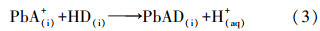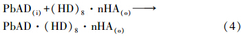 在能夠產生正協同萃取效應的DNNSA-P204混合反膠團體系中,由于HA的存在,廢水中鉛離子的萃取機理可能發生改變:由于HA水溶性比HD大,當水相和有機相接觸時,有機相中的HA和水相中的HA或者A-快速建立平衡,當金屬離子與HA結合后,較易進入有機相;在油水界面是HD單分子層,在有機相中HD與HA依靠分子間氫鍵形成了混合反膠團,此時: