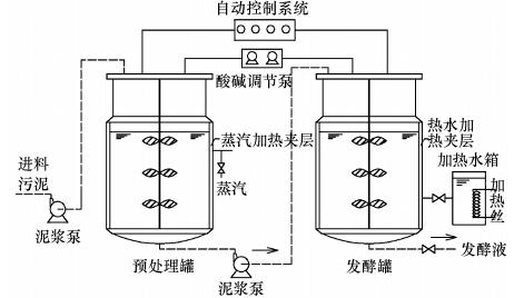 實驗裝置為鎮江東方生物工程設備技術有限責任公司生產的自動機械攪拌不銹鋼發酵罐(GUJS-30C型),發酵罐個數為2個,一個用于進行污泥的預處理,另一個則進行發酵反應.每個發酵罐的容積為30 L,裝液量為21 L.整個發酵罐配有自控系統,可以實時監測和調控發酵溫度、轉速、pH.工藝流程和發酵罐模式圖如圖 1所示.