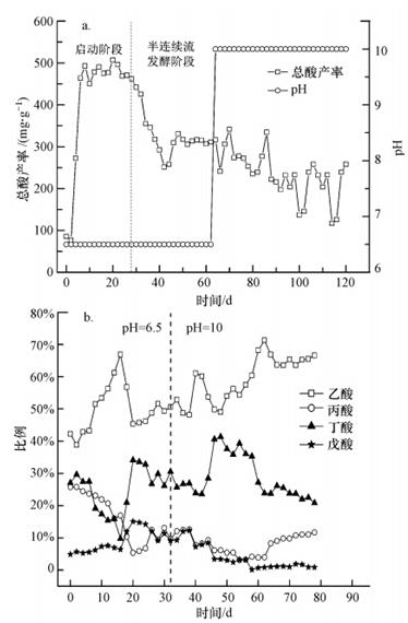 圖 2 發酵過程中總揮發性脂肪酸產率(a)及半連續流階段有機酸構成比(b)