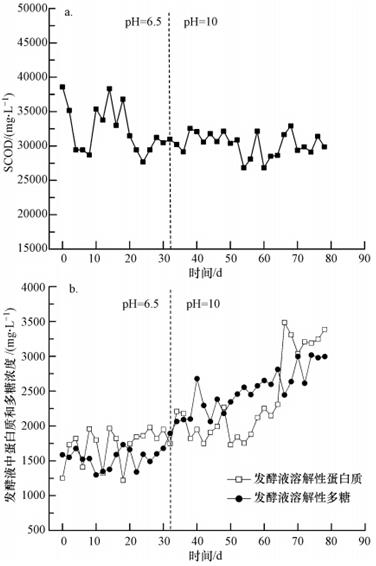 圖 3 半連續發酵過程中的SCOD(a)、溶解性蛋白質和多糖(b)的變化情況