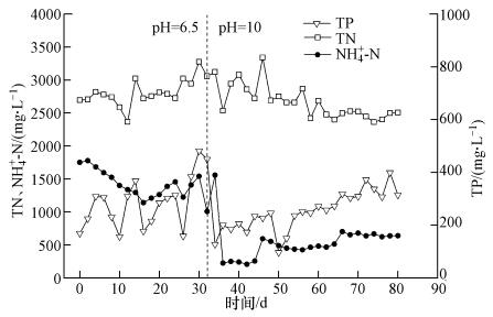 發酵過程中污泥發酵液總氮、氨氮和總磷的變化如圖 4所示.可以看出,發酵pH為6.5時,TN和TP的平均濃度分別為2812 mg · L-1和286 mg · L-1;而pH為10.0時,TN和TP的平均濃度分別為2665 mg · L-1和284 mg · L-1,兩種pH條件下TN和TP差別不大.但兩種pH條件對氨氮濃度影響較大,發酵pH為6.5時,發酵液中氨氮濃度比較高,平均濃度為1411.04 mg · L-1(占TN的50.52%),而pH為10.0時,氨氮平均濃度降低至534.43 mg · L-1(占TN的19.52%),這是因為銨根離子在堿性pH條件下轉化為氨氣所致(Yu et al., 2013).TN和TP發酵過程的變化說明熱堿預處理后污泥中的氮磷元素基本釋放,熱堿預處理的水解效果良好,發酵罐運行穩定.