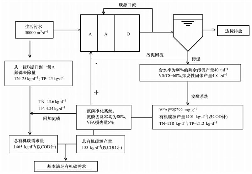 圖 5 污泥產酸發酵液回用于污水處理廠提標改造脫氮除磷所需碳源的質量衡算圖