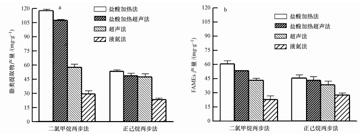 圖 1 兩步法不同破壁方法每克干泥對(duì)應(yīng)脂類提取物質(zhì)量(a)及FAMEs質(zhì)量(b)
