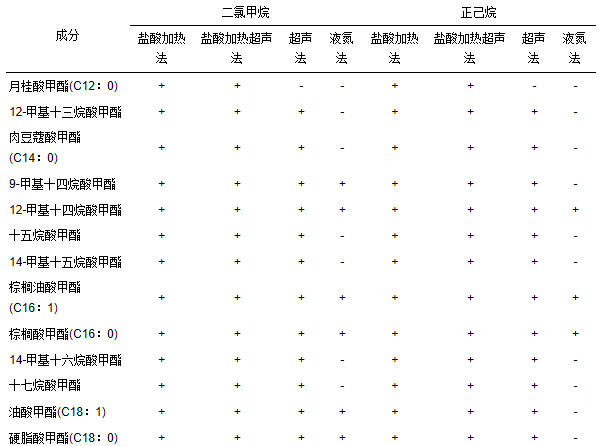 甲酯化后所得FAMEs產(chǎn)量如圖 1 b所示,可以看出,只有一部分脂類提取物被甲酯化,與其他文獻(xiàn)(Dufreche et al., 2007; Mondala et al., 2009)結(jié)果類似,原因可能是提取物中含有其他不參與甲酯化的脂類物質(zhì).所得FAMEs產(chǎn)量基本與脂類提取物產(chǎn)量成正比,其中,鹽酸加熱法(二氯甲烷提取:(60.4±3.5)mg · g-1,正己烷提取:(45.5±3.2)mg · g-1)與鹽酸加熱超聲法(二氯甲烷提取:(53.2±0.3)mg · g-1,正己烷提取:(43.3±4.1)mg · g-1)有較明顯的優(yōu)勢(shì),超聲法其次(二氯甲烷提取:(42.7±2.5)mg · g-1,正己烷提取:(38.2±3.9)mg · g-1),液氮法甲酯化后產(chǎn)量依然很低(二氯甲烷提取:(22.4±4.4)mg · g-1,正己烷提取:(27.3±2.2)mg · g-1).
