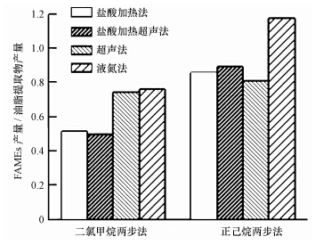 1)制備生物柴油兩步法中采用鹽酸加熱破壁的效果最好,而制備生物柴油一步法則是采用超聲破壁的產(chǎn)量最高.