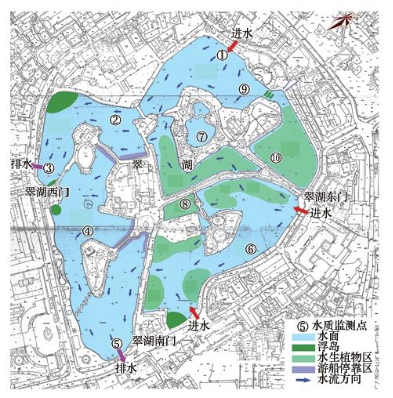 按照每月1次的采樣頻率,在湖面選擇10個監(jiān)測點(diǎn)(圖 1)進(jìn)行代表性污染物的連續(xù)監(jiān)測,包括進(jìn)水點(diǎn)1個(1#)、排水點(diǎn)2個(3#和5#)、湖心點(diǎn)3個(2#、4#和9#)、湖岸點(diǎn)2個(6#和7#)、水生植物區(qū)2個(8#和10#).由于翠湖屬于淺水湖泊,因此,每個采樣點(diǎn)均只采集水面(0 m)及水面下0.5 m處水樣,取二者平均值作為這一監(jiān)測點(diǎn)的污染物濃度.